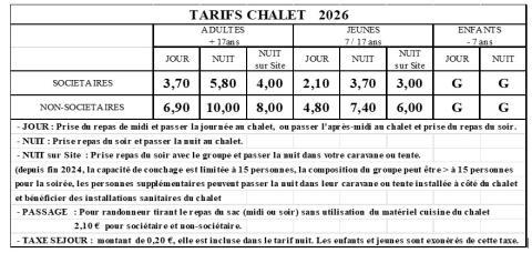 La commission chalet s’est concertée pour fixer les tarifs de l’année 2026, Ces tarifs ont été validés lors du comité CBL du 22 octobre. La capacité couchage au chalet est toujours limitée à 15 personnes maxi, toutefois pour la soirée la composition du groupe peut dépasser ce nombre ; les personnes supplémentaires peuvent passer la nuit dans leur camping-car ou leur tente stationnés à proximité du chalet et bénéficier des installations sanitaires de la maison.