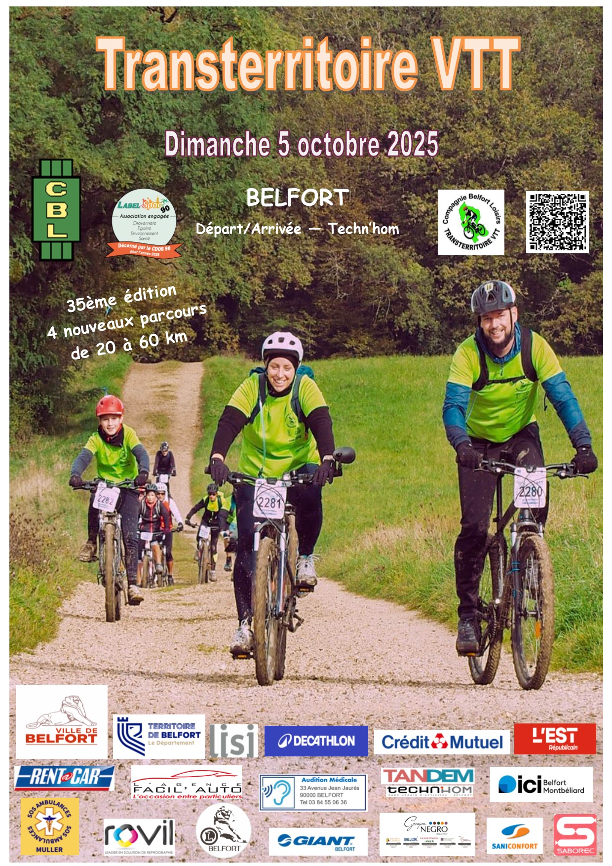 La TRANSTERRITOIRE est une manifestation populaire de V.T.T créée en 1990, qui emmène les participants sur les chemins de traverse du Territoire de Belfort et des départements limitrophes.